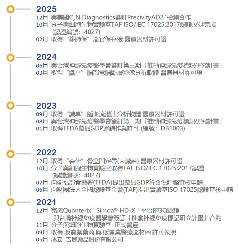 吉晟藥品股份有限公司成立於2021年5月,本公司董監事均為國內知名藥品公司之創辦人。吉晟藥品擁有先進的生技醫藥業專用之冷鏈技術與材料,亦將上市AI人工智慧協助醫師快速診斷中風;同時,設有全國最專精於神經免疫科學實驗室,以及先進的生醫材料開發部門。