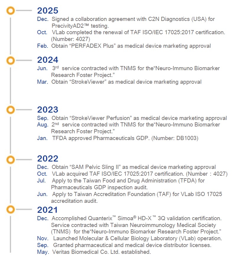 Veritas shall continue to develop medical technologies, invest in employees, create value, and elevate its competitiveness. Guided by its five core values, Veritas is committed to business growth, benefiting patients, and serving clients, while sharing success with employees and rewarding its shareholders.