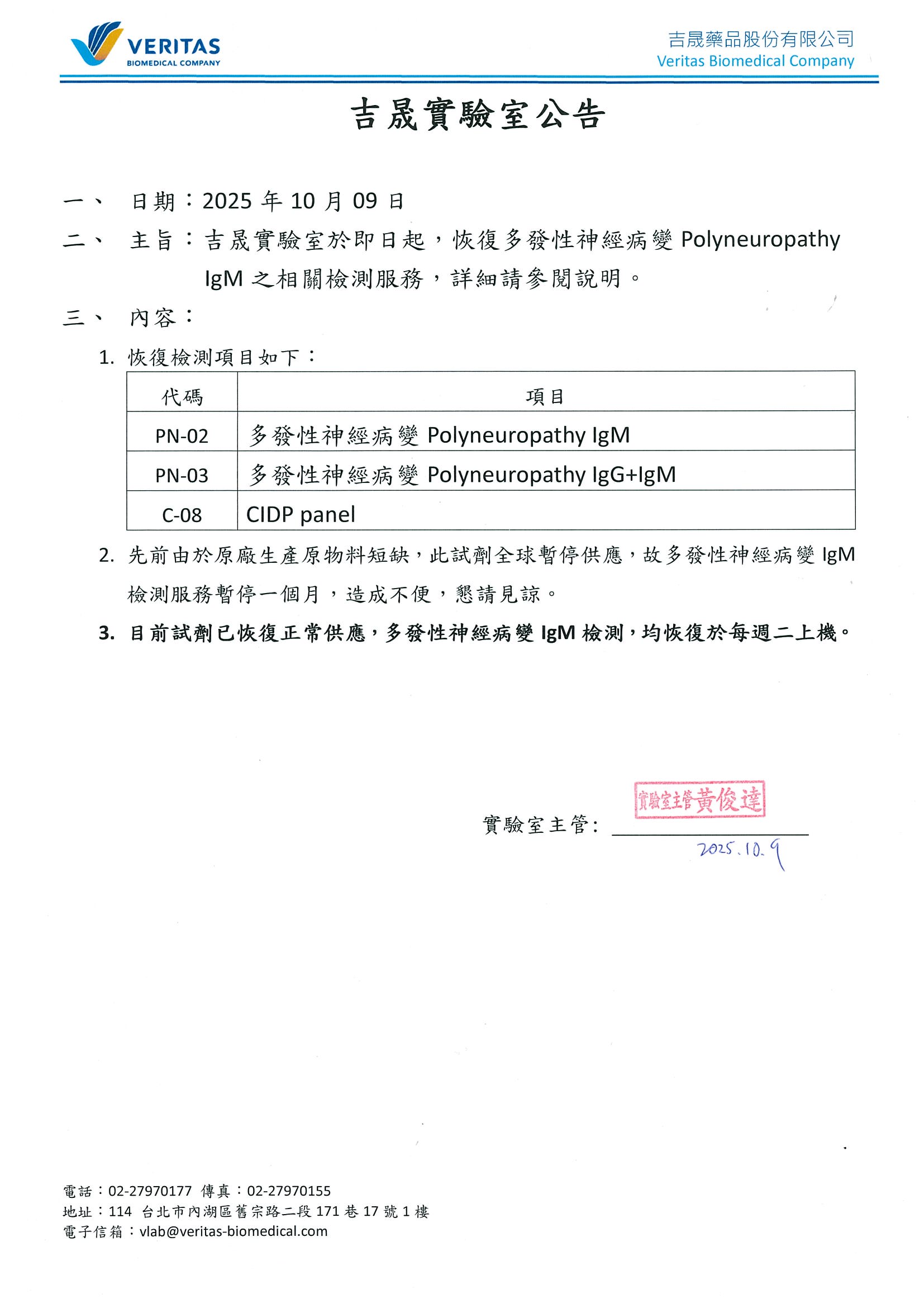 - 目前試劑已恢復正常供應,多發性神經病變IgM檢測,均恢復於每週二上機。